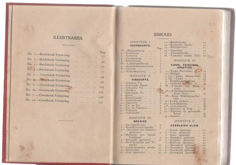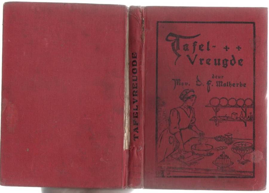 'N KOSBARE ANTIEKE HARDEBANDBOEK. DIE VOORWOORD DEUR DIE SKRYWER DATEER AAN DIE EINDE VAN DIE EERSTE WERELDOORLOG! VERGELING IS SIGBAAR ASOOK VETKOLLETJIES EN HANTERINGS MERKIES. 'N UITTERS SKAARS EN KOSBARE RESEPTEBOEK. DIE BORDE TOON VERWERING WEENS DIE HOE OUDERDOM!