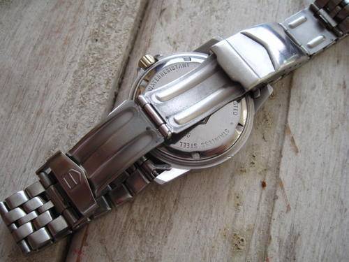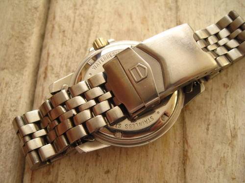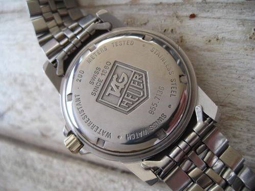 The case back is marked Tag Heuer Swiss Since 1860, 955.713G, Swiss Watch, Water-resistant 200 Meters, Stainless Steel. The clasp is marked with the logo, Stainless Steel 611/8, Tag Heuer. The case measures 41mm including the crown and 45mm from lug tip to lug tip and will fit a wrist up to 7 ½”. This quartz watch is running and keeping time. The dial has some discoloration around the center, which is quite common on this dial for some reason or another (I have had a few of these over the years, and they all exhibited similar discolouration).