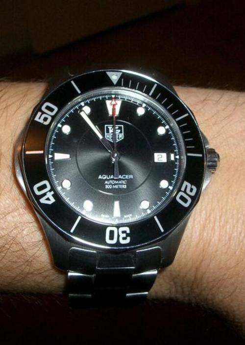 Designed for optimal performance both in and out of the water, this handsome automatic watch blends sporty prestige styling with optimal readability. The 42 mm case is crafted from a solid block of stainless steel and showcases a black dial with bold luminous hands and markers and a red-tipped seconds hand. The dial also features a tonal TAG Heuer logo and a date display at the three o'clock hour. Framing the dial is a unidirectional rotating bezel, in matching black, with oversized Arabic numerals and a luminescent marker at the 12 o'clock position. The handsome link bracelet, in brushed steel, fastens securely with a fold-over-clasp with safety and features an extension system so that the watch can be worn over a diving suit. Other notable features include a scratch-resistant sapphire crystal and a screw-in crown and caseback for water resistance to 300 meters. Calibre 5 automatic movement means that this watch winds itself with the natural motion of your wrist and does not require a battery.
