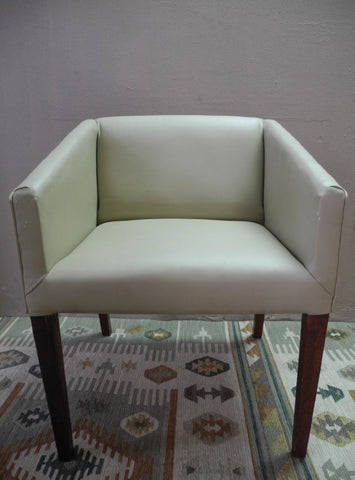 This stylish vintage retro faux leather tub chair with straight wooden legs is in good condition with some wear as shown in the pics. One could re upholster the chair to suit your home decor. It is a beautifully made solid occasional chair. This fabulous minimalistic style chair has a very strong Scandinavian influence and would look stunning in a styled living room or reception area of your home. It would also be beautiful in a bedroom or dressing room. The chair measures 65cm x 62cm x 76cm high. This chair is perfect in a bedroom, study, lounge etc. Please view the pics carefully to fully appreciate this vintage retro chair and to confirm the condition.