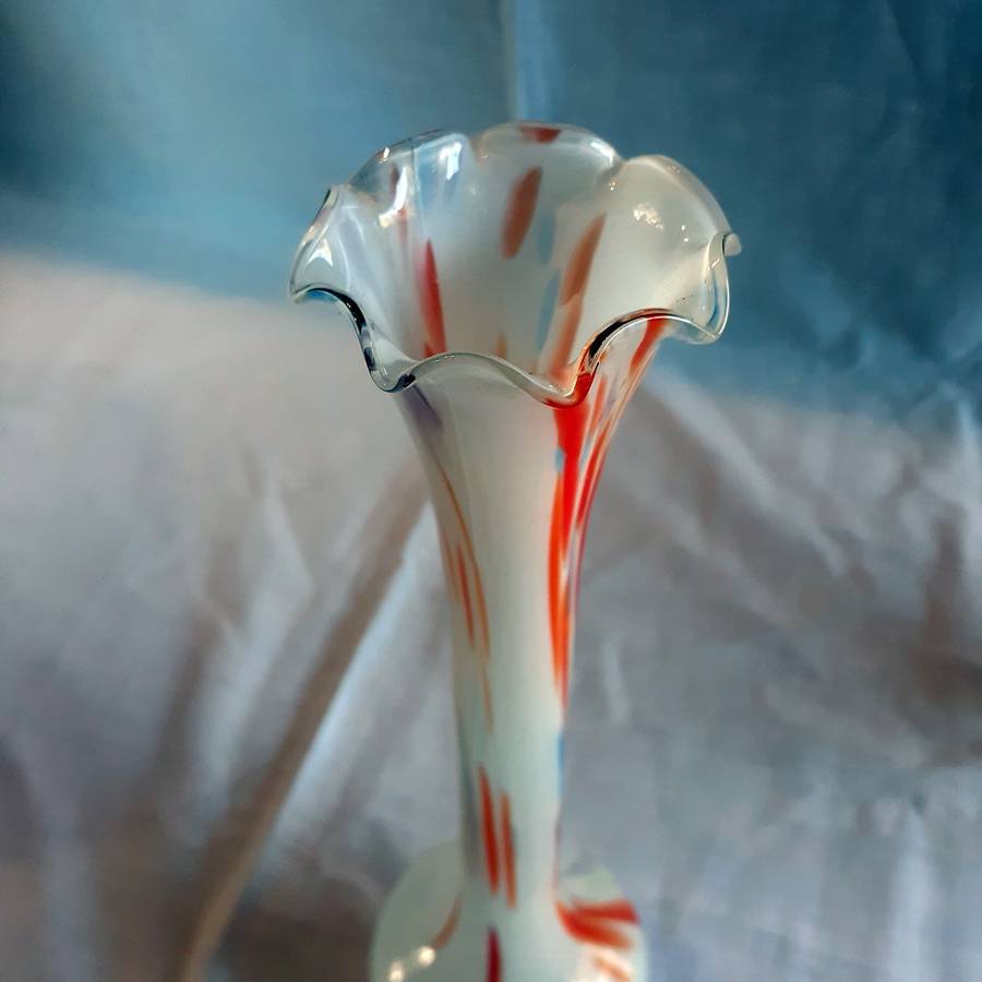 Pretty Art Glass Vase - white cased glass with swirls of autumn colours and fluted top. In good used vintage condition. Please look at the pictures and dont hesitate to ask any questions.