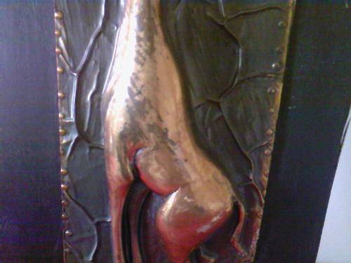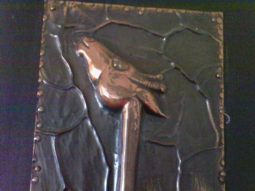 This beautiful signed piece of art was done by Mbali (or M Bali) in 1965. Unfortunately I cannot find any information on this artist. The copper plaque has been mounted on a piece of wood, which considering its age (the wood) really shows signs of wear. It should be easy to just refinish the wood or replace it altogether. There is absolute no damage to the copper plaque.