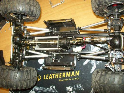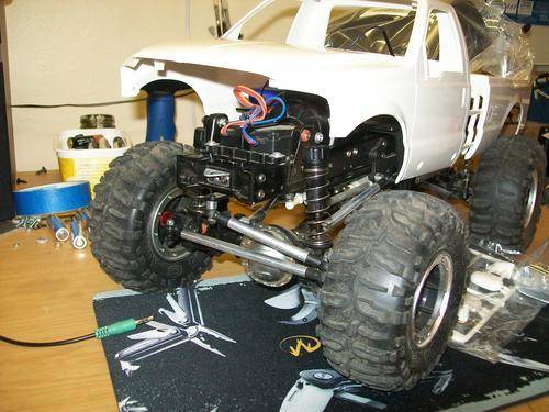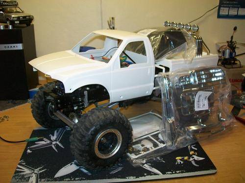 Tamiya Ford F350 3-speed RC truck. This truck comes with the original leaf springs, not fitted at the moment with the original shocks plus a 4-link Junfac suspension (fitted) There is also a Junfac Servo locator plate for the front axle(not pictured) included in the deal. All the other pieces that is taken off to fit the 4-link suspension is included. The manual, original decals and box is included. Shocks are Tamiya CVA long shocks. Truck runs with 2.2 Losi crawler tyres with foams on Tamiya CR-01 beadlock wheels. Old body that was yellow has been replaced with a new one, unpainted plus all the new chrome bits and new windscreen.