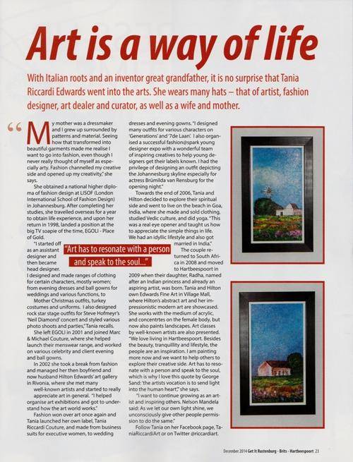 Tania Riccardi qualified as a fashion Designer. She worked, as a Head Designer, at EGOLI- Place of Gold TV serial and made wardrobes for various characters. Tania joined Marc & Michael Fashion Designers for a period of time. She then ran her own design studio and concentrated on private clientele. Tania also made clothes for various characters on Generations, TV serial.