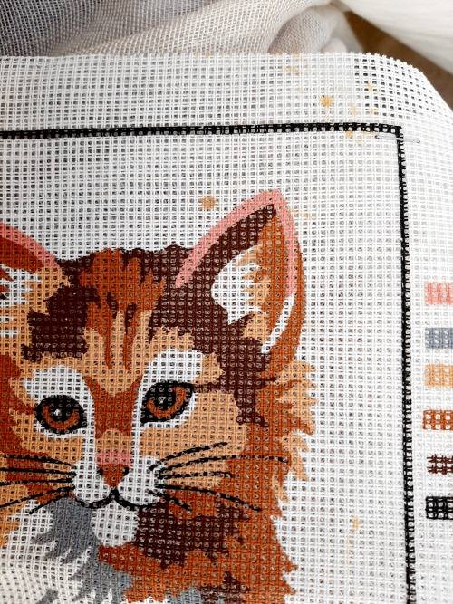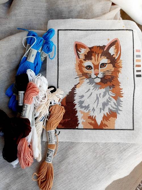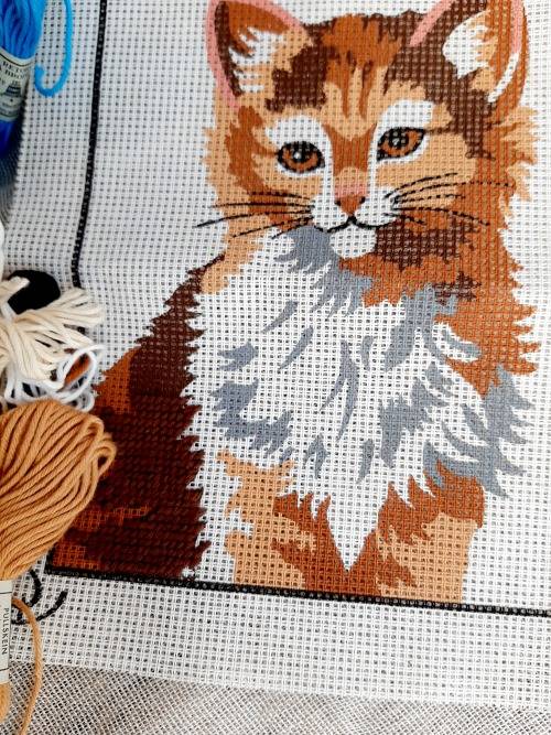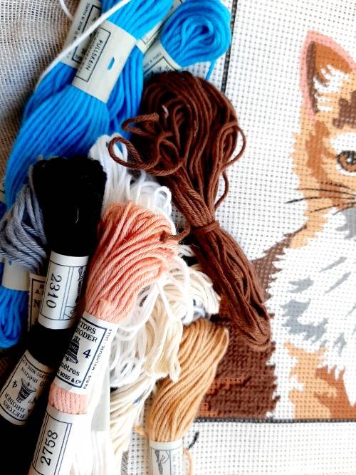 This has been half completed. I have included blue yarns for the background. There are a few marks on the canvas but these will be covered by the stitches once complete.