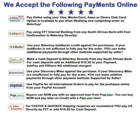 Pocket Knives, Ninja Samurai and Kantana’s Swords, Stun Guns, Tasers, Real Tree Print Camo Clothing, Air soft BB Metal Guns, Military, Security, Signed Memorabilia and More. Click on the link http://www.bidorbuy.co.za/seller/456989/spyguy