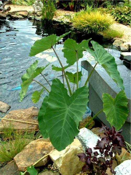 A large, showy, marginally aquatic plant with heart-shaped, dark green leaves on long "stalks". Plant them in a container, or near water for best effect, or use them to achieve that tropical look in gardens. They do the best in a semi shade position, but can tolerate both sun and shade well. Tubers are edible once boiled.