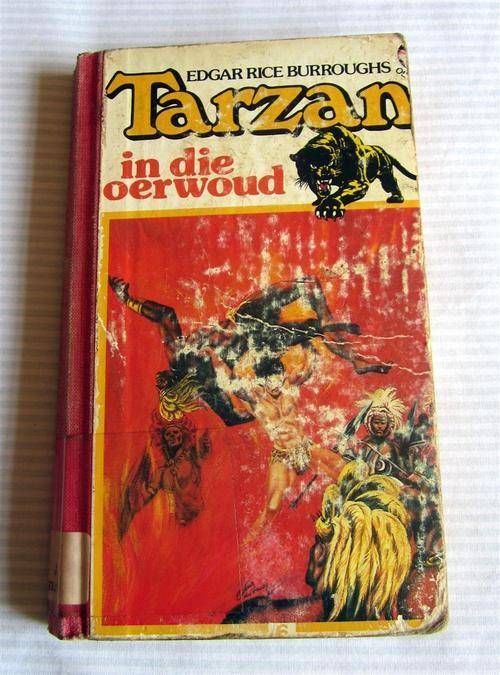 Ex-library with the usual pocket, sticker and stamps. First Afrikaans 1984 print and consists of 182 pages containing some black and white 1949 copyrighted illustrated drawings of Tarzan. Some tanning of pages involved. This publicatition appears to have a special hardcover in that the front and back covers were specially reinforced, as was done with paperbacks in those days to prevent damage.Secure binding. Outside cover condition as shown below.