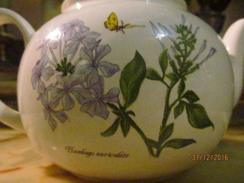 Locally Crafted Porcelain Teapot decorated with a BEAUTIFUL "Plumbago auricwate" (Cape Plumbago) with a Butterfly above. This image appears on both sides of the Teapot. This LOVELY item has a Lid which has a Orb Filial and the Lid is decorated with a Green Leaf and Vine pattern.