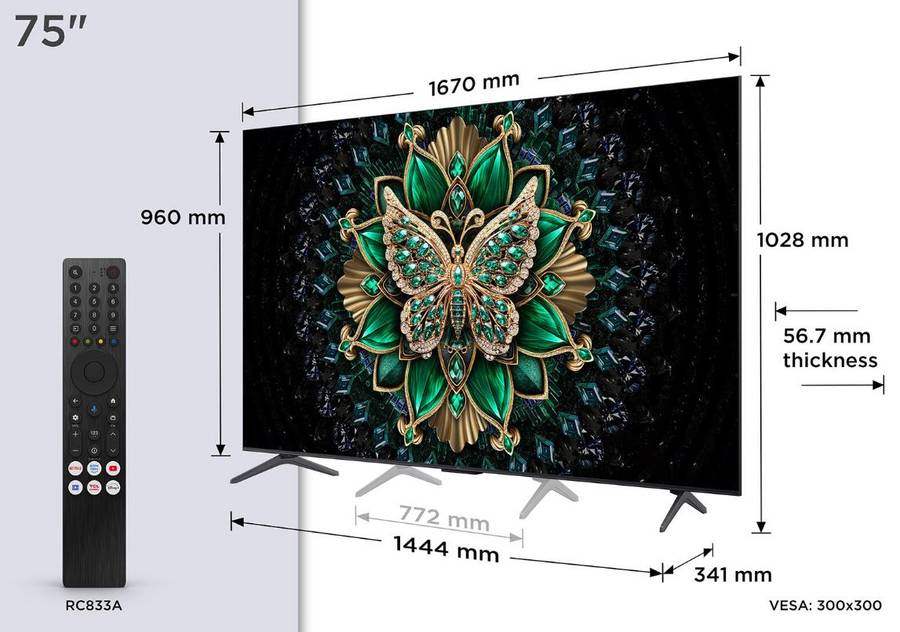 TCL 75 Inch QD Mini LED 4K Google TV Resolution 3840 x 2160 (4K UHD), Native Refresh Rate 144Hz , Color Gamut 93% DCI-P3, HDR Support Dolby Vision IQ, HDR10+, HLG, Contrast Ratio 5500:1, Peak Brightness up to 1000 nits. Audio: ONKYO 2.1 Hi-Fi system with 2x10W midrange speakers and 20W subwoofer, Processor AiPQ Pro for advanced image processing, Operating System Google TV with Google Assistant. Connectivity includes 4x HDMI 2.1 (eARC/ARC), USB 2.0/3.x, Ethernet LAN, dual-band Wi-Fi, Bluetooth 5.4. Dimensions without stand: approx. 1890 x 1086 x 57.9 mm; with stand: 1890 x 1161 x 372 mm, Weight approx. 23 kg, VESA mount 600 x 400 mm. Warranty 3 years.