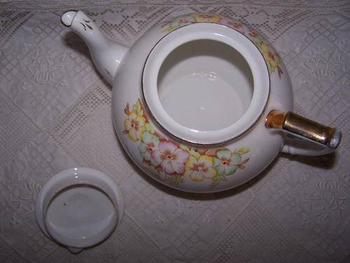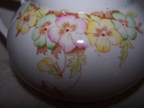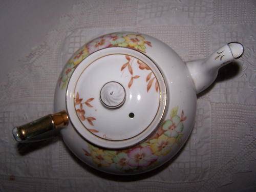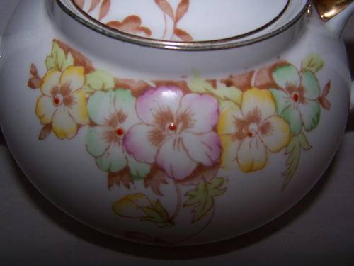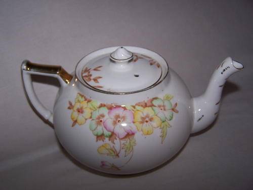 This pretty, hand coloured, vintage bone china tea pot was made by Bell China, England.