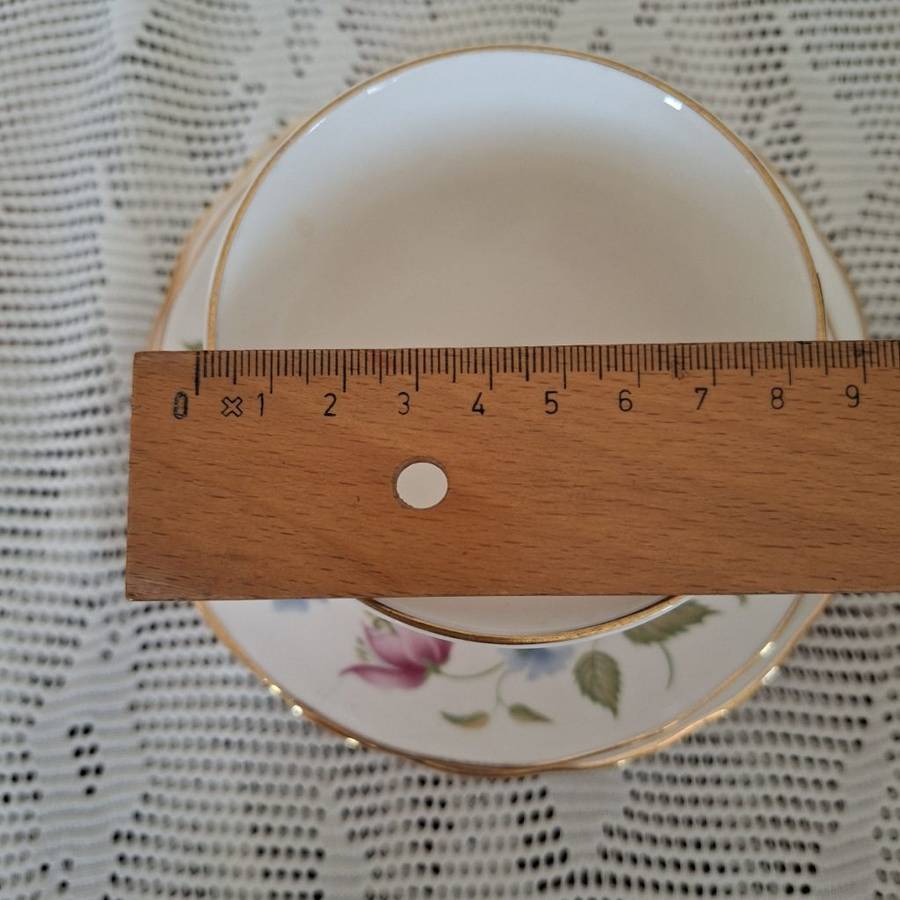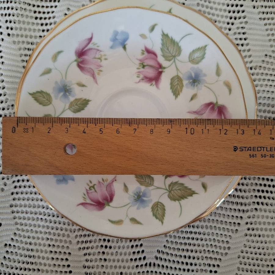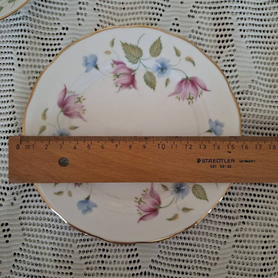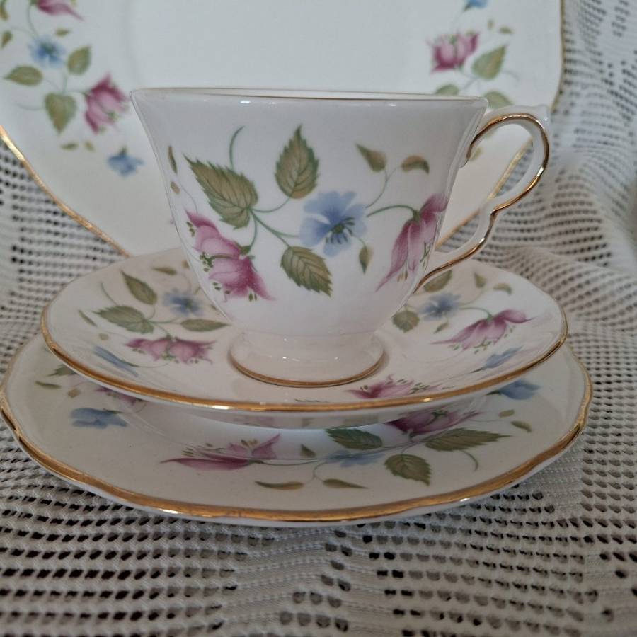 Pretty floral queen anne porcelain tea set. In good used vintage condition. Please note there is a small chip to the outer edge of the milk jug. 6 trios, milk jug, sugar basin and lovely sandwich or cake plate.
