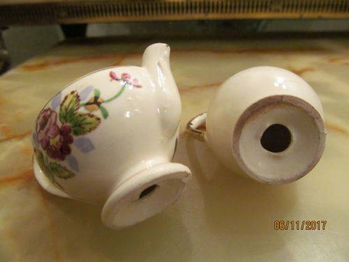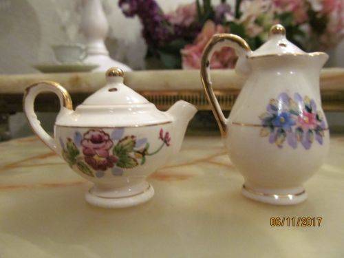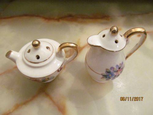 VINTAGE PAIR OF MINIATURE FINE PORCELAIN SALT SHAKERS - TEAPOT & COFFEE POT