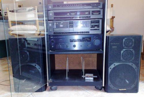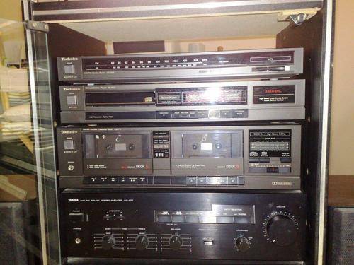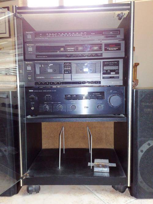 4)Yamaha 4 channel amplifier + 2 Technics Speakers + Cabinet with glass door in excellent condition. All components are working perfectly.