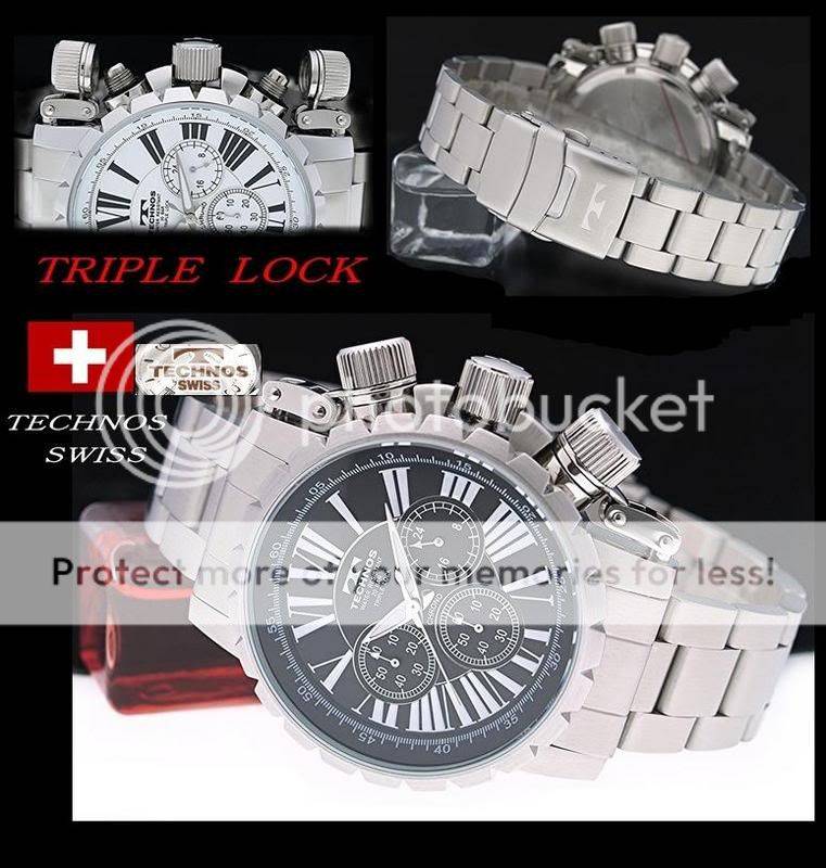 TECHNOS SWISS TRIPLE LOCK All Stainless Steel Quartz Movement Chrongraph Function XXX Size 4.8cm ( with Crown ) Bracelet with Security Clasp Lenght 20cm x 2.0cm wide 20 atmosphere waterproof Chronograph 1 Year Manufacturer Guarantee New Design Stop Function Central Second Triple Lock Security Clasp