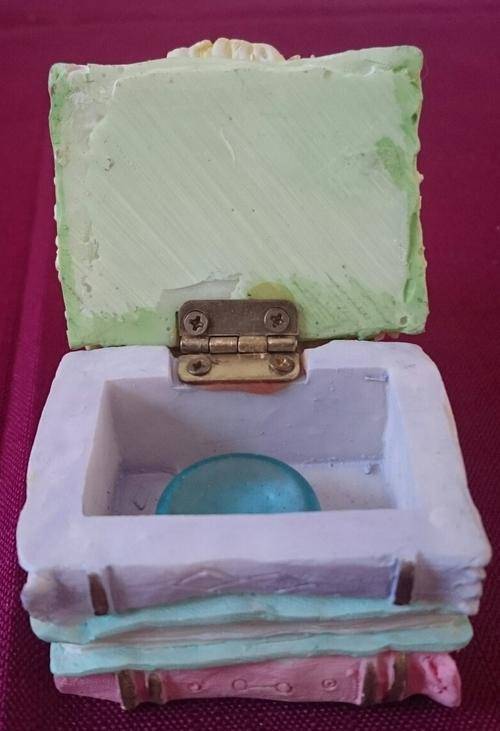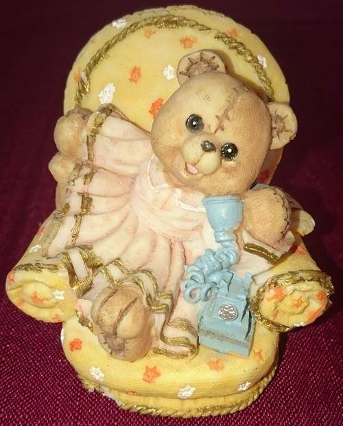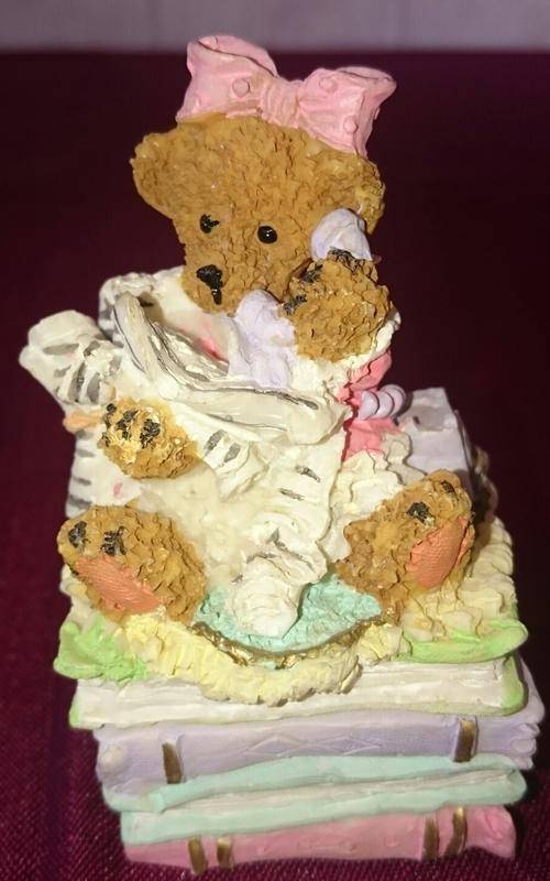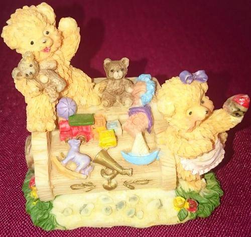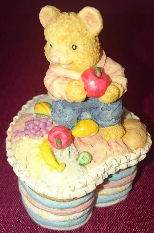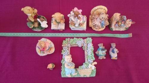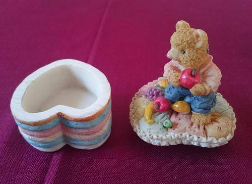 These teddy bears are so cute and so well made! In very good condition. Includes a Heart shaped trinket box with lid, and a square hinged trinket box that opens up, a picture frame, etc. See all the photos for more detail. The tallest is about 9cm high.
