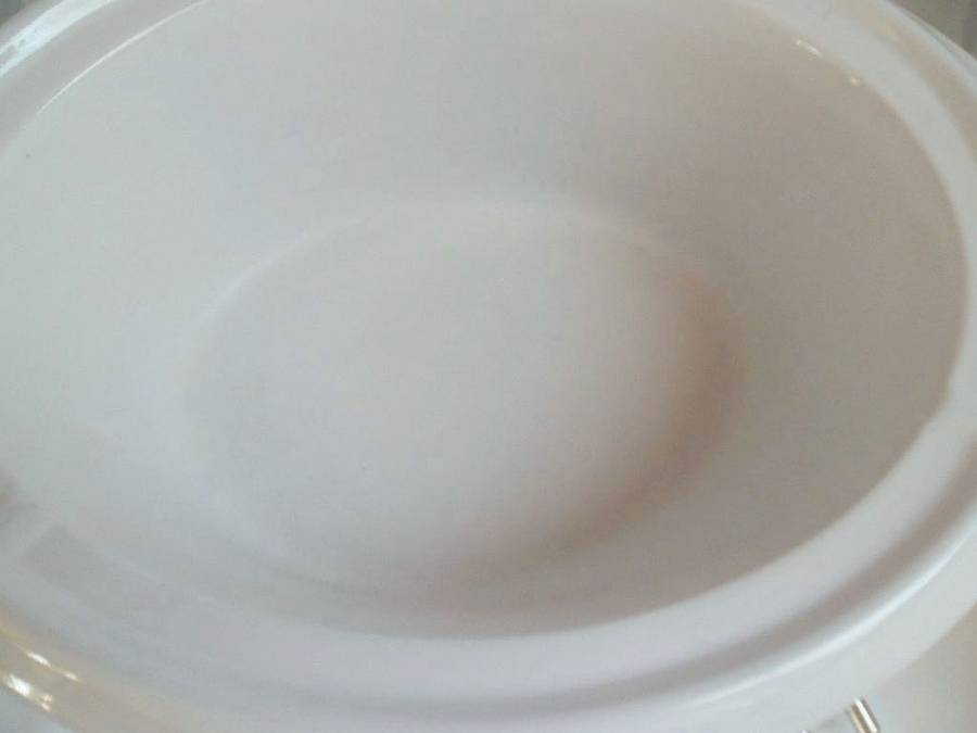 The item is beautifully cleaned! The size of the bowl is 35 cm x 27 cm and holds comfortably 3 litre, 230 V & 220 W.