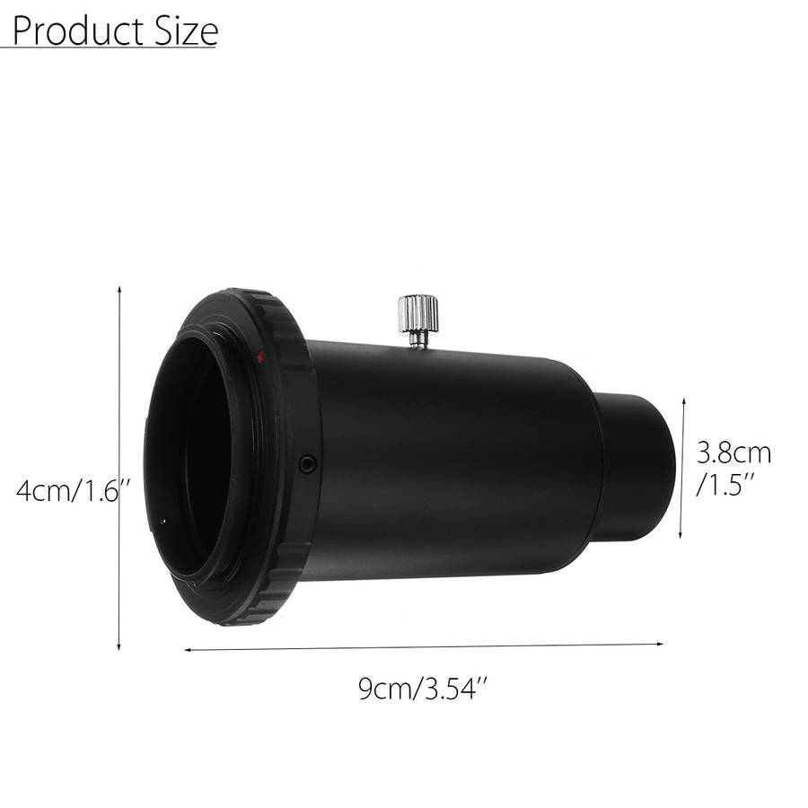 It offers 1.25 inch mounting sizes on telescope side. M42 x 0.75mm outer thread on one end and standard 1.25inch (31.7mm) fitting on the other which fits for telescope mount adapter. It is compatible for Nikon camera Product name: Telescope Extension Tube Color: Black Material: Aluminum Size: 9cm x 4cm/ 3.54 x 1.6inch Diameter of Inner Thread: 3.8cm/ 1.5cm