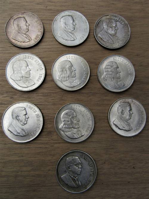 Ten South African 1960s 80% silver One rand coins. Bid per coin to take all or less. See some with "suid" Uncleaned