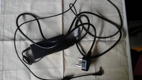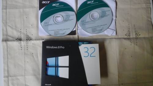 IT COMES COMPLETE WITH A STANDARD THREE PRONG PLUG. ACER RECOVERY DISCS AND WINDOWS 8 32BIT CD.