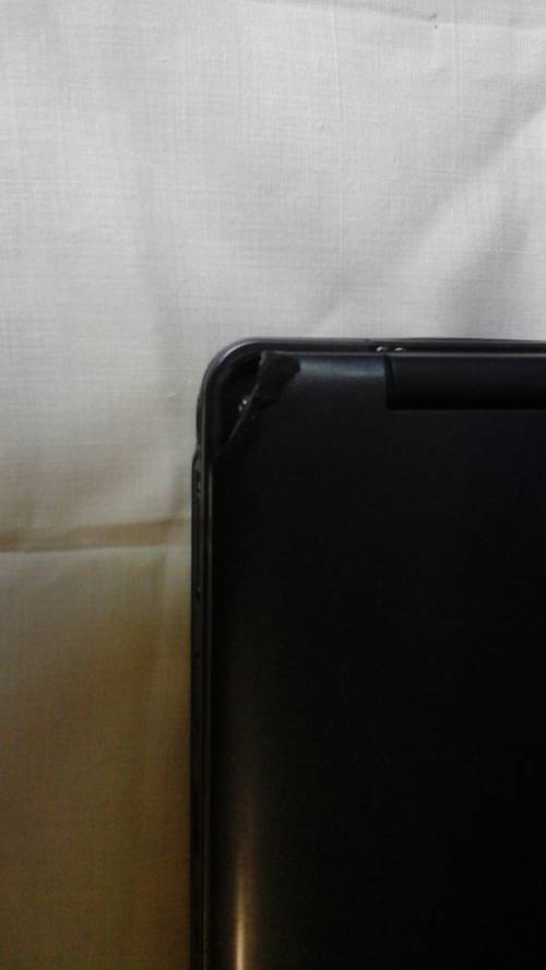 IT IS OVER 5 YEARS OLD SO HAS SLIGHT SCRATCHES FROM USE. THE BACK LEFT CORNER HAS A SMALL PIECE MISSING. IT ONLY HOLDS CHARGE FOR 30 MINUTES THEN NEEDS TO BE PLUGGED IN. OVERALL IT IS IN GOOD WORKING CONDITION.