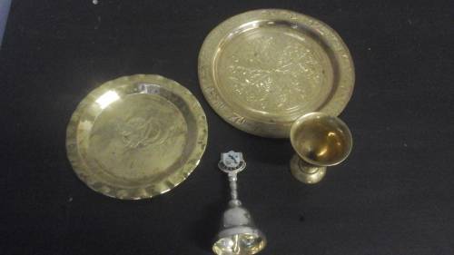 TERRIFIC COLLECTION OF BRASS AND A PLATED BELL.