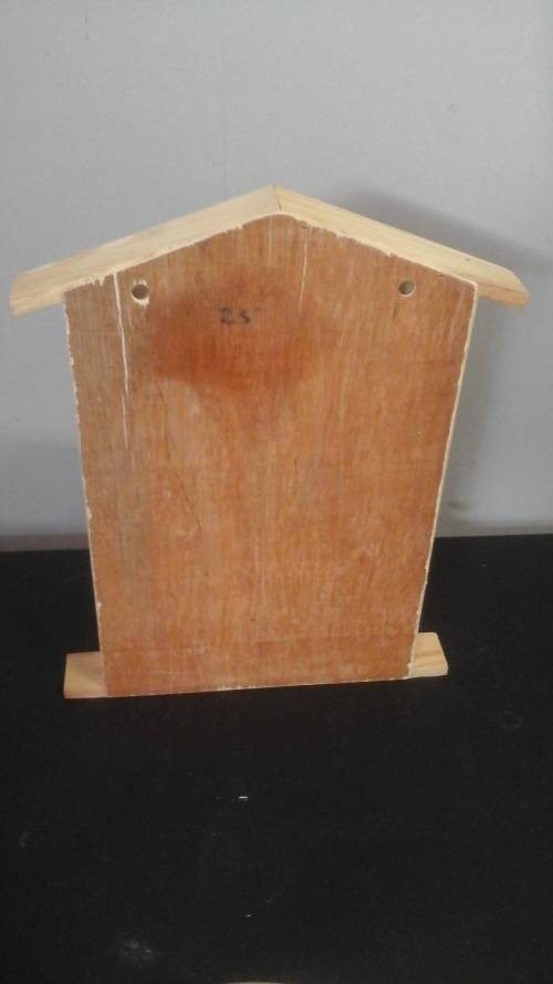 THIS FANTASTIC PIECE RESEMBLES A HOUSE AND IS MADE OF WOOD AND IS A LIGHT BROWN IN COLOR.