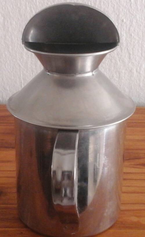 THIS FANTASTIC PIECE IS MADE FROM STAINLESS. IT HAS A LONG DIAGONAL SPOUT AND A HINGED LID.