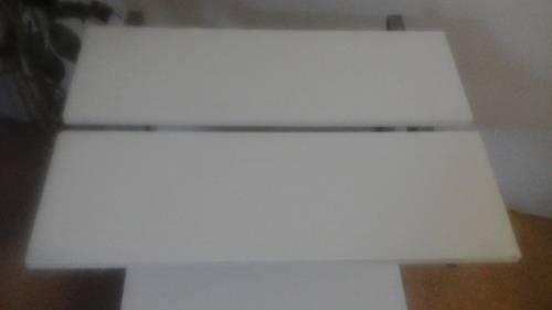 THIS AWESOME PIECE HAS A STEEL FRAME AND IS CREAM AND GREY IN COLOR AND RECTANGULAR IN SHAPE. THE SURFACES ARE MADE OF WOOD.