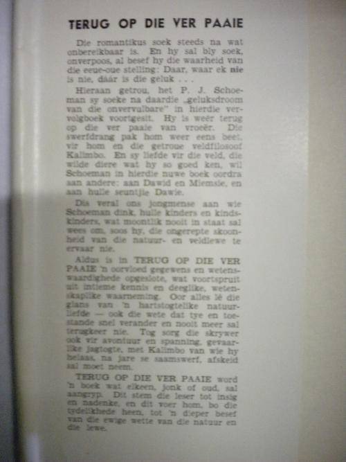 Terug op die ver paaie deur PJ Schoeman. Stofomslag het skeure en vuil plekke maar inhoud is goed. Onder 1kg.