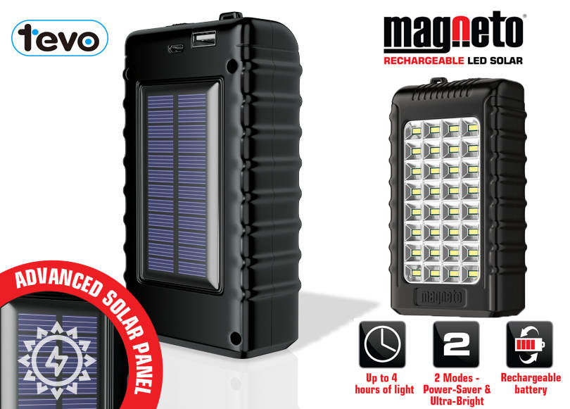 Be prepared in any household emergency with the Magneto Rechargeable LED Solar light. With 900 lumens of illuminating power, an advanced solar panel for charging and a USB port for charging most mobile phones, this LED solar light proves its reliability in time of need!
