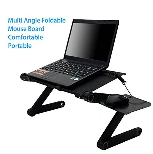 Light weight; high strength aluminum tray; sturdy fully adjustable legs with mouse pad. Makes carrying easy and holds your computer firm and steady. Rotate 360 degrees and lock in place at various angles. Quickly collapse the stand to make it portable. Desk converter; laptop base; ergonomic laptop riser; desk raiser; laptop cart; laptop holder; etc. Use it any way you want it- table can also be used as a breakfast tray; standing desk; book tray; writing desk; tablet holder; stand up desk; gaming table; notebook stand; keyboard lift; laptop tray; keyboard riser; foldable laptop desk; cooling pad; computer stands for laptop; adjustable pedestal fan; folding tray table; standing desk converter; laptop base; ergonomic laptop riser; desk raiser; laptop cart; laptop holder; etc. No assembly required - collapsible frame for easy storage and portability. Can be set in multiple angles to fit any body position; even laid back on your bed; just hold the button on the joints; change the position; and release the button to lock it in place.