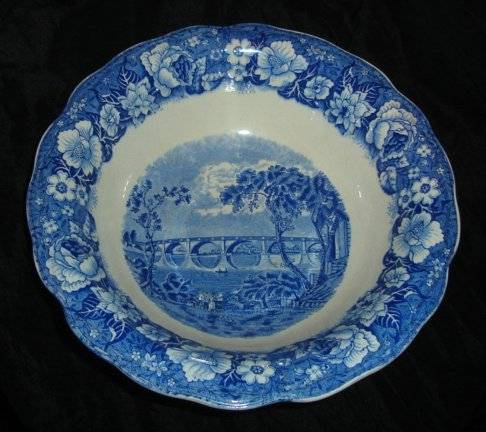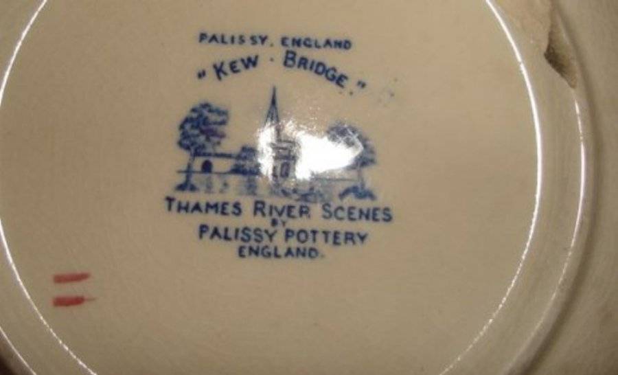 A BEAUTIFUL SERVING BOWL MARKED, KEW BRIDGE, THAMES RIVER SCENES by PALISSY POTTERY, ENGLAND, diameter 23cm, height 6.5cm, chip to base.