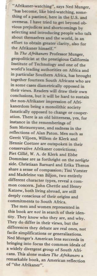HARD COVER BOOK IN A NEAT CONDITION. NED MUNGER BRINGS INTO FOCUS THE COMMON IDEALS OF A WIDELY DIVERGENT GROUP OF SOUTH AFRICANS....THIS ALONE MAKES THIS A REMARKABLE BOOK!