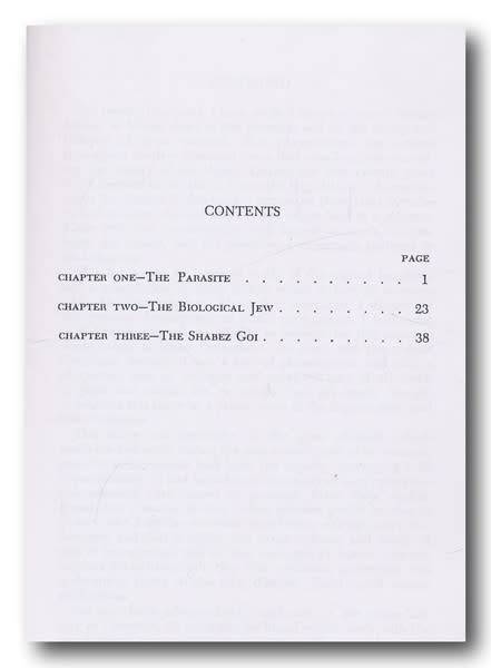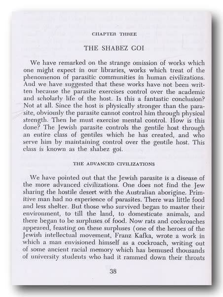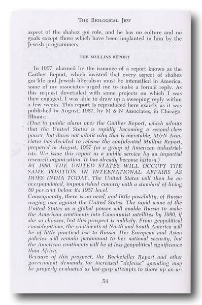 He attempts to show that Jews have an instinct to controlling things and much of the book is devoted to atttempting to awaken Americans to the threat posed by Jewish hegemony, and predicts that America would be in total cultural decline by the 1980s.