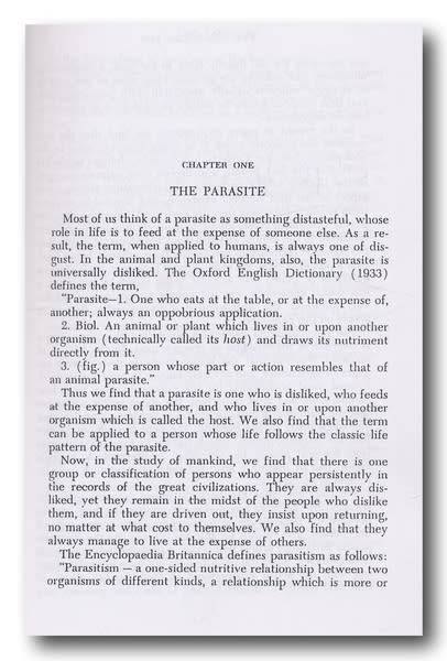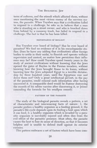 In 1968, Mullins authored the tract, The Biological Jew, an objective analysis of the forces behind the decline of Western Culture. He demonstrates that the main influence that people were overlooking in their analysis of world affairs was "parasitism". He begins by describing parasitism in the animal kingdom, then comments on the work of the macro-historians Oswald Spengler and Arnold Toynbee (who he sees as derivative of Spengler and a "shabbez-goi historian"), and proposes that if we look at society as if it were an organism, then the Jews would be equivalent to parasites overtaking that organism.
