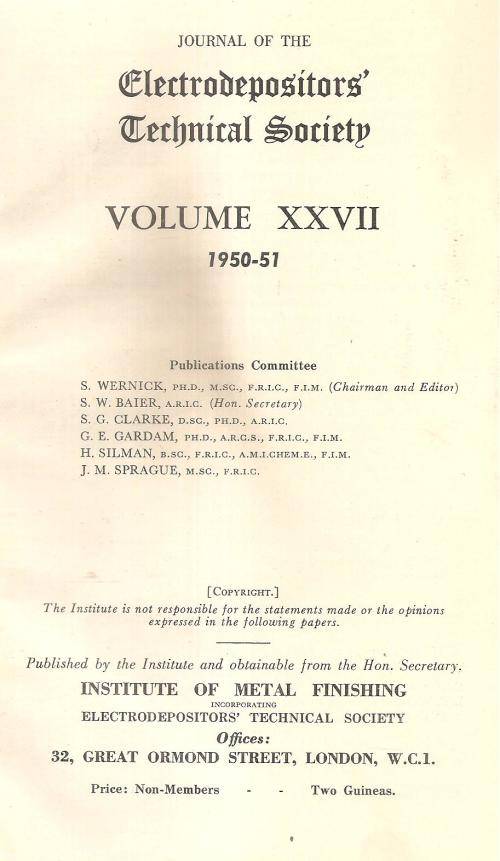Electrodepositors Technical Society Volume XXVII 1950-51 By: The Institute of Metal Finishing