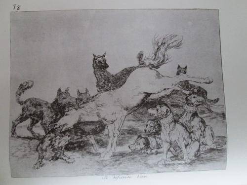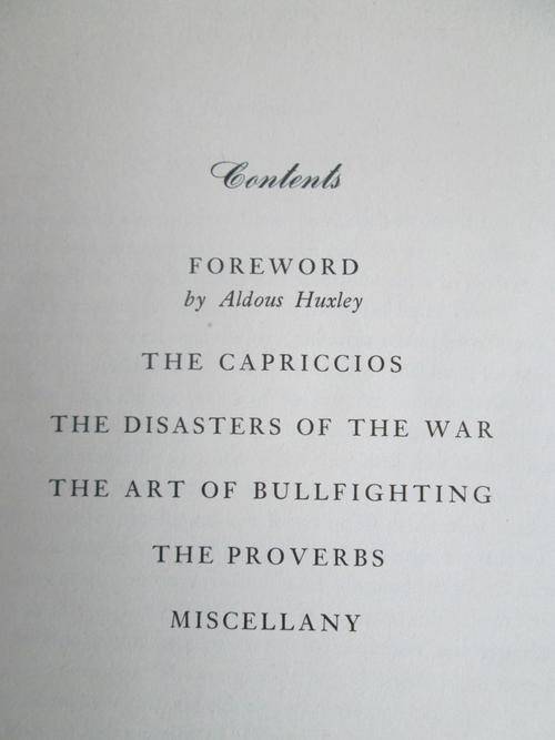 Large format hardcover with dust jacket. First Edition by Crown Publishers, New York, 1943. Foreword by Aldous Huxley. 126 pages, 268 etchings. The etchings are divided into five groups: The Capriccios; The Disasters of the War; The Art of Bullfighting; The Proverbs; and Miscellany. Book in very good condition, the dust jacket is worn/torn and has been reinforced with paper on the inside. Tear to front endpaper, as pictured. Tracked Postage & P is R50.00.