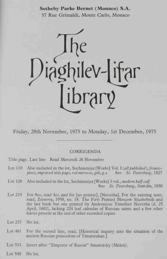 The Diaghilev-Lifar Library=Sotheby-Parke Bernet,Monaco,S.A.=1975=Auction Catalogue of Russian Books