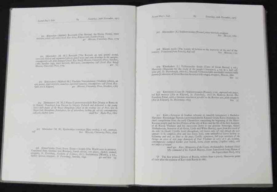 Decorated and Embossed green Boards with black and gilt decoration. No faults. Full-colour front illustration. 217 pages, 32 black and white reproductions throughout. Auction catalogue (November 28 - December 1, 1975) of Russian rare books, pamphlets, drafts and old musical scores of the 16th, 17th, 18th and 19th century originally collected by Sergei Diaghilev (1872-1929), including listings for the first Russian book printed in Moscow (1564), and first editions of Gogol, Tolstoy, Dostoyevky and Pushkin. Introduction by Serge Lifar (1905-1986) is in French, the catalogue listings are in English. Eight hundred and twenty-six lots up for bid over the four-day sale. A solid, clean and crisp copy without inscriptions or markings, gilt to original green boards remains bright. Complete with the original corrigenda slip and an unused bidding slip laid in. In a good if somewhat edge-nicked & creased glassine wrapper.
