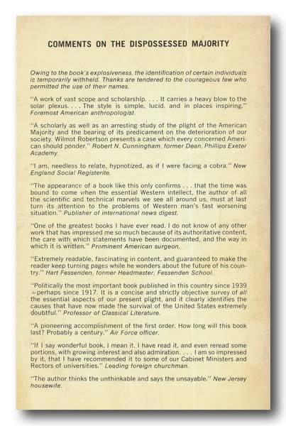 The Dispossessed Majority by Wilmot Robertson (Revised paperback 1973). Large A5, Paperback, 586 pages.Cover bit worn - fatty stain right bottom corner. Book in good readable condition.