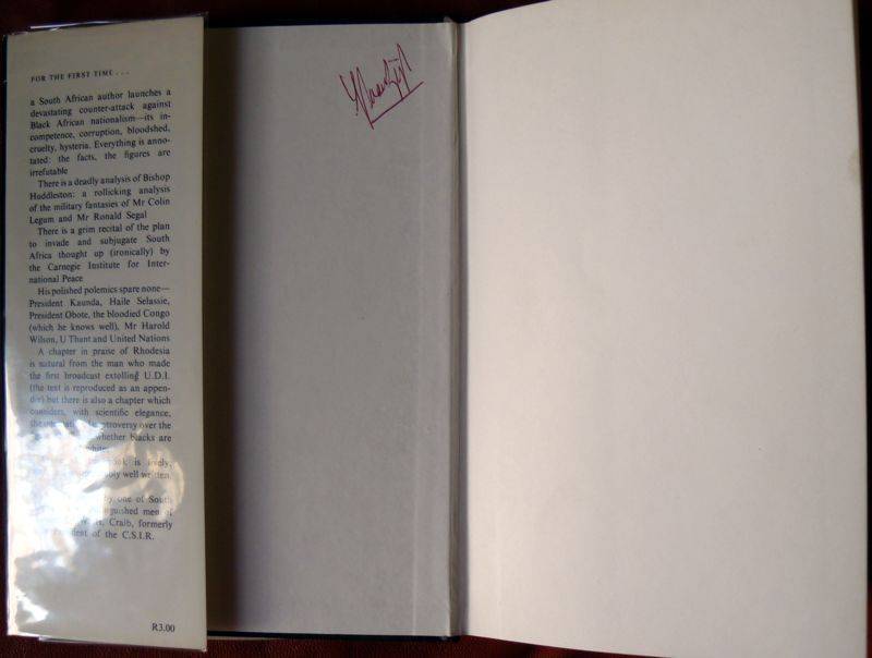 hard cover in dust jacket. Black cloth boards with silver foil author, title and publisher on the spine, corners are bumped. text block has dust on the head. Otherwise very clean, with tight binding, front paste down endpaper has a previous owners signature. Dust Jacket is very good, a little shelf rubbed, bumped at corners with a little light chipping at head and tail of spine, is Un-clipped. Barnett Potter launches a devastating counter-attack against Black African nationalism - its incompetence, corruption, bloodshed, cruelty, hysteria. Everything is annotated: the facts, the figures are irrefutable.
