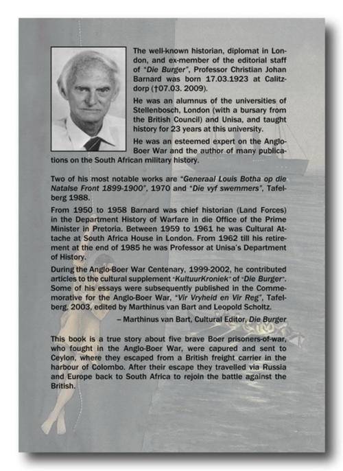 New!! The Five Swimmers by prof Johan Barnard. 275 pages, 33 photos, hard cover. A true story about five brave men, who fought in the Boer War, got caught and was send as Boer War Prisoners to Ceylon. After they escaped they travelled through different European countries and came back to SA to fight with Gen. Manie Maritz.