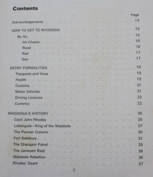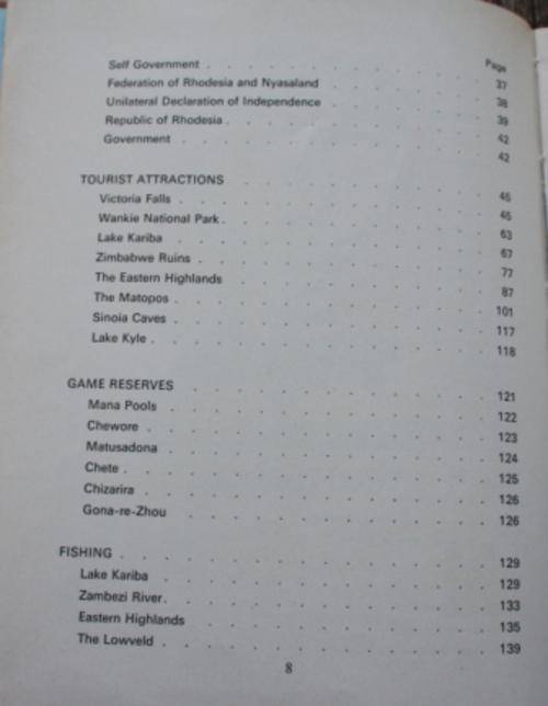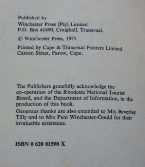 " The Guide to Rhodesia is not merely another book for the tourist, although Rhodesia can offer so much to the holiday visitor - the incomparable Victoria Falls, the mystery of Zimbabwe, the vastness of Kariba and the sight of wild animals in their natural habitat.