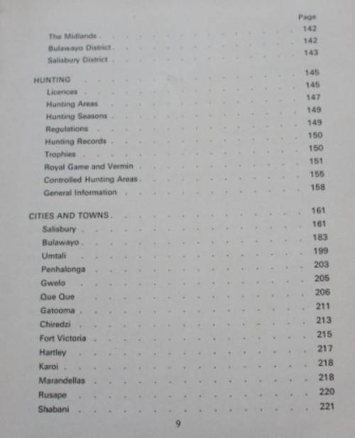 There are many who may be seeking not only somewhere to visit but a place to settle, so the Guide gives information on the economy of the country, its agriculture, mines, commerce, industries and its potentialities in which those wishing to make their home in Rhodesia may share. The Guide gives also some details of the events that have made Rhodesia, and a picture of the social life which has developed in this land of sunshine and opportunity."