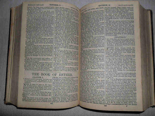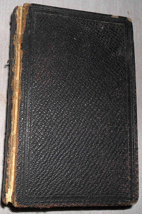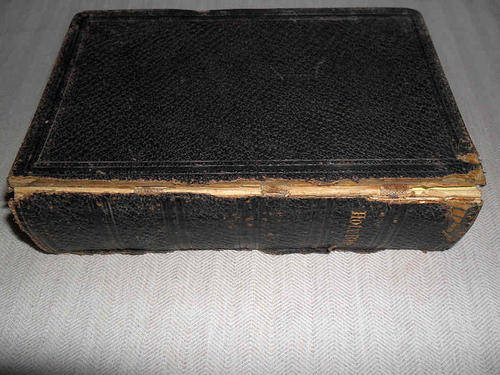 BIBLE 14 X 9 CM - 1893 !!! - PLEASE SEE PHOTOS BELOW - DAMAGE ALONG SPINE ON COVERS BUT STILL AFFIXED TO TEXTBLOCK - NICKS AND STAINING AS INDICATED - THE REST OF THE TEXTBLOCK IS STILL FINE