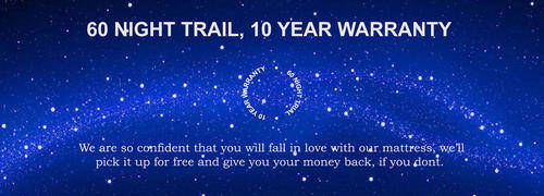10 year warranty. 60 Night trial: If for any reason you do not want to keep your mattress, we will give you a 100% refund, no questions asked.