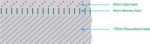 A 40mm top layer of latex foam gives bounce and coolness while a 40mm second layer of memory foam provides comfort and support. The final base layer of polyurethane foam is 170mm and provides a supporting force and durability.