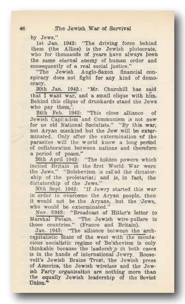 The Jewish War of Survival by Arnold Lesse (reproduced 1977). A5, Paperback, 111 pages.Cover slightly worn. Book in good readable condition. Written by the pre-war leader of the Imperial Fascist League, this book offers proof that powerful Jews were the major force pushing for the war. Leese argued that behind the world unrest at that time was a Judeocentric design to build a Jewish world police state on the ruins of the 'Gentile' nations. The author refutes every argument given at the time on why Britain should have entered World War II. Many were the same as were later given with respect to the invasion of Iraq, e.g.: "We are meeting a challenge to our security." This volume shows how Hitler wanted peace with Great Britain, but International Jewry wanted conflict and war, and they got their way. It quotes Jewish sources and their cronies in which they acknowledge the Jewish elite's power, desire, and need for war in order to survive.