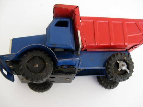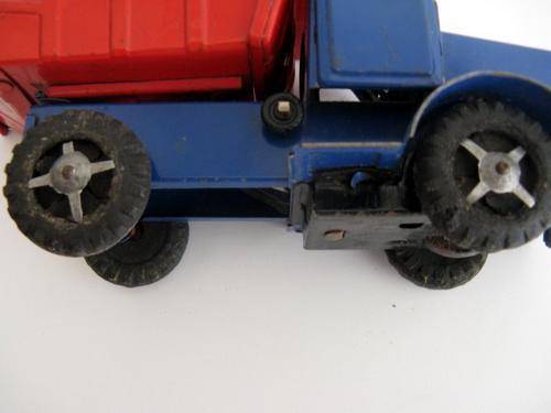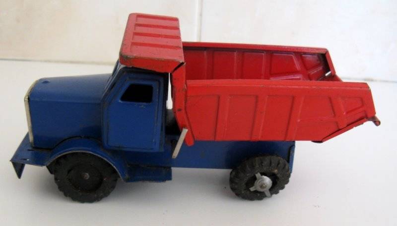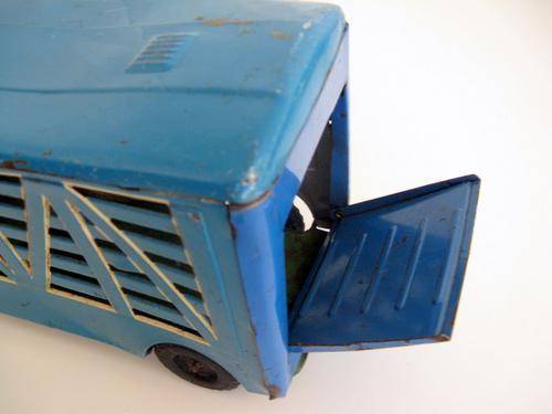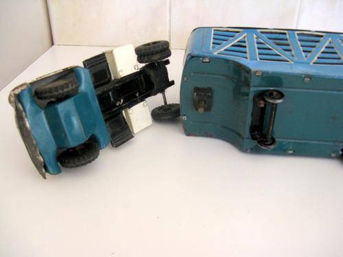 I assume these 2 belong together because the colour of the truck underneath is the same colour as the main body of the horsebox. Dent needs to be taken out of roof of horsebox. Friction mechanism on the truck is working. Measures 35cm across. The truck measures 17cm across and the horsebox 21cm across